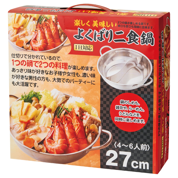 ●ピリッと辛い系、やさしい豆乳系、2つの味を楽しめる仕切り付きのお鍋です。 ●4〜6人分対応の直径27cmサイズなのでホームパーティーにぴったり! ---------- ●容量:約3,000ml ●持ち手付き化粧箱入り |