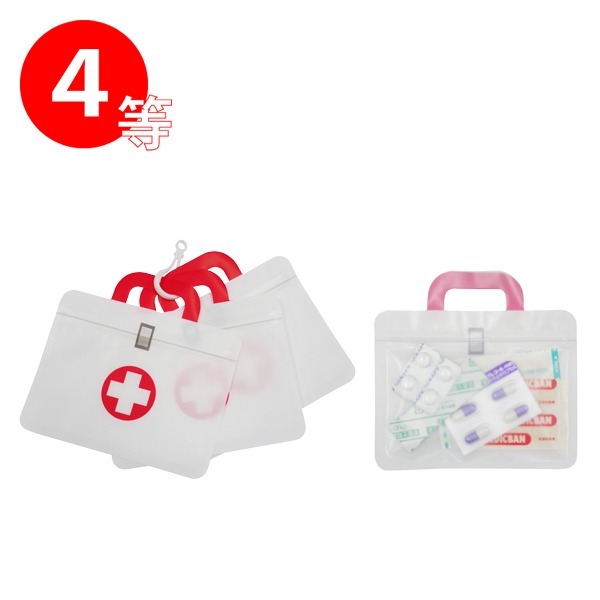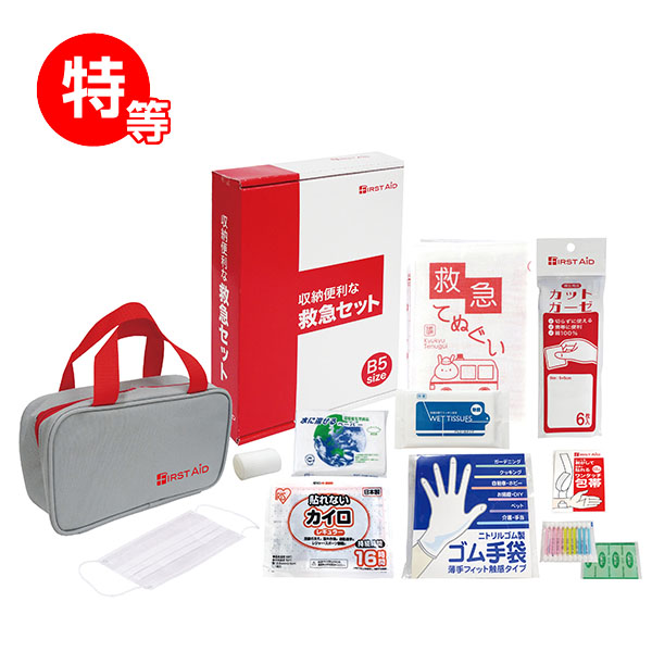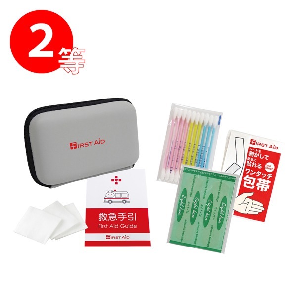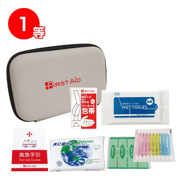 ●セット内容 特等 収納便利な緊急14点セット FF-30N 1個 1等 コンパクトファーストエイドキット7点セット CF-10R 2個 2等 コンパクトファーストエイドキット6点セット CF-06 3個 3等 救急てぬぐい 4個 4等 救急ジッパーポーチ3P 90個 ●付属品:抽選箱×1、くじ×100、明細表×1、店頭用お知らせPOP×2、A3ポスター×1 ---------- ●収納便利な緊急14点セットFF-30N セット内容:収納ポーチ、抗菌伸縮包帯、カイロ、救急手ぬぐい、折りガーゼ、除菌アルコールウェットティッシュ、マスク、ワンタッチ包帯、ハンドジェル×3、綿棒10P、絆創膏5P、ゴム手袋 ●コンパクトファーストエイドキット7点セットCF-10R セット内容:収納ケース、救急手引、ワンタッチ包帯、絆創膏5P、綿棒10P、水に流せるペーパー、除菌アルコールウェットティッシュ ●コンパクトファーストエイドキット6点セットCF-06 セット内容:収納ケース、絆創膏5P、ワンタッチ包帯、綿棒10P、コットンパフ3P、救急手引 ※一部色・柄・商品が変更になる場合があります。 ※お支払いは銀行振込でお願いいたします。 |