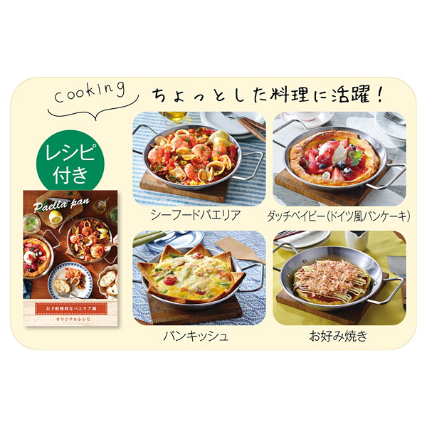 ●アウトドアでも自宅でも活躍するパエリア鍋です。 ●カンタン便利なレシピが付いています。(シーフードパエリア、ダッチベイビー(ドイツ風パンケーキ)、パンキッシュ、お好み焼き) ●直火OK、IHヒーターOK ●化粧箱入り ※お支払いは銀行振込でお願いいたします。 |