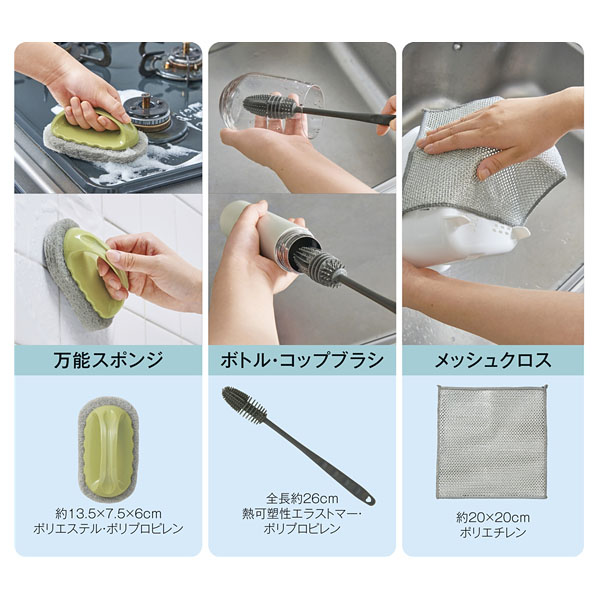 | 商品サイズ | 万能スポンジ:約135×75×60mm ボトル・コップブラシ:全長約260mm メッシュクロス:約200×200mm |