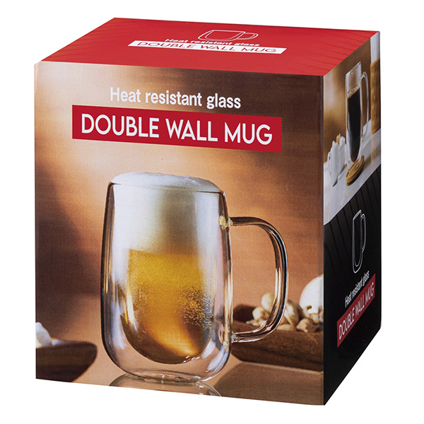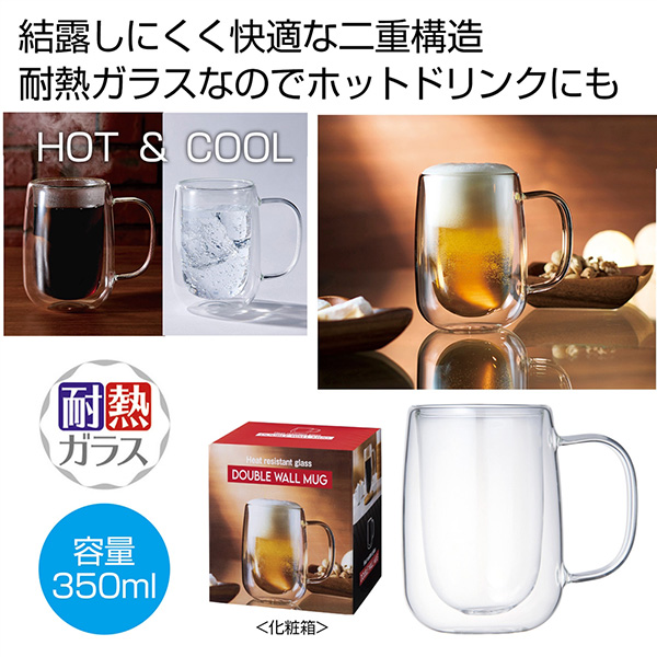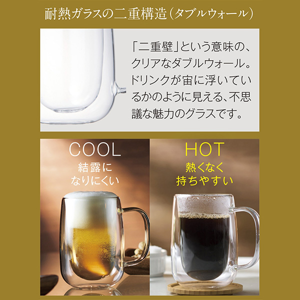 結露しにくく快適な耐熱ガラス二重構造のジョッキ。