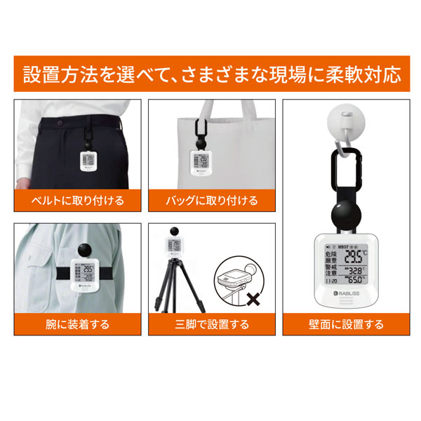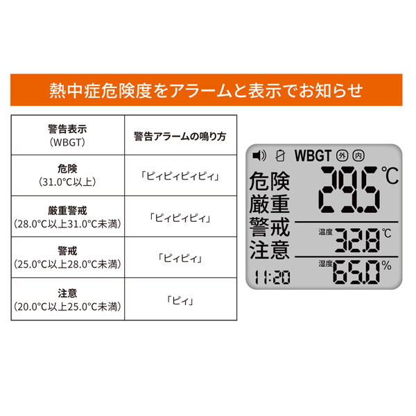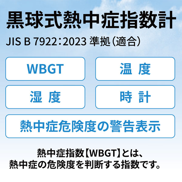 ●黒球があることで、日差しや地面の照り返しによる輻射熱を測ることができ、「実際に体が感じる暑さ」を数値化。 ●屋外・屋内を問わず、熱中症リスクの把握が可能となり、運動中や作業中の安全管理に役立ちます。 ●気温・湿度・日差し(輻射熱)をまとめて評価し、暑さの危険度(WBGT値)を表示。 ●JIS B 7922:2023 準拠(適合) ーーーーーーーーーーーーーーーーーーーーーーーーー ●WBGT 測定範囲:0.0〜50.0℃ 0.1℃単位 精度:15.0〜40.0℃ ±2.0℃、それ以外は±3.0℃ ●温度(気温) 測定範囲:-9.9〜60.0℃ 0.1℃単位 精度:20.0〜50.0℃ ±0.6℃、それ以外は±1.0℃ ●湿度(相対湿度) 測定範囲:0.1〜99.9% 0.1%単位 精度:30.0〜90.0% ±5.0%、それ以外は±10.0% ●保管環境:温度-10.0〜60.0℃、湿度0.0〜100.0%(結露なきこと)、風速0.3〜3m/s ●使用環境:温度5.0〜60.0℃、湿度20.0〜80.0%(結露なきこと) ●警告アラーム:音量3段階(大・小・なし) ●電源:CR2032コイン形リチウム電池×1個、DC3V ●電池寿命:約9ヶ月(警告アラーム音なし) ●質量:約60g(電池含まず) ●付属品:カラビナ、バンド(長短各1本)、取扱説明書、お試し用電池 |