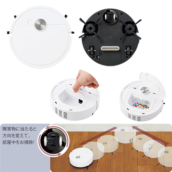 ●せまい場所にも入り込めるコンパクト設計。 ●障害物に当たると方向を変えて、部屋中をお掃除。 ●グングン吸引! ●ゴミ捨てカンタン! ●単3形アルカリ乾電池2本使用(別売) ●化粧箱入り |