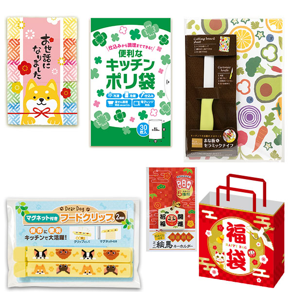 ●セット内容:キッチンスポンジセット、ミニまな板&セラミックナイフ、キッチンポリ袋、マグネット付きフードクリップ(2個組)、ミニ絵馬キーホルダー、福袋小 ●おみくじ付きのミニ絵馬キーホルダーもおまけで入っており、新年をより一層楽しめます。 ※袋詰めはお客さまでお願いします。 ※数量限定のため、内容が一部変更になる場合がございます。 ※お支払いは銀行振込でお願いいたします。 |