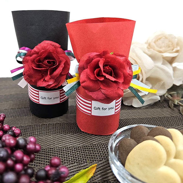 黒と赤のパッケージにローズと色とりどりのリボンがポイントのプチギフト。