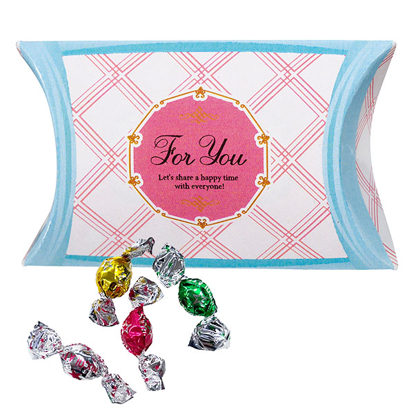 コロンとしたピロー型パッケージにまん丸のチョコレートを4つ封入しました。