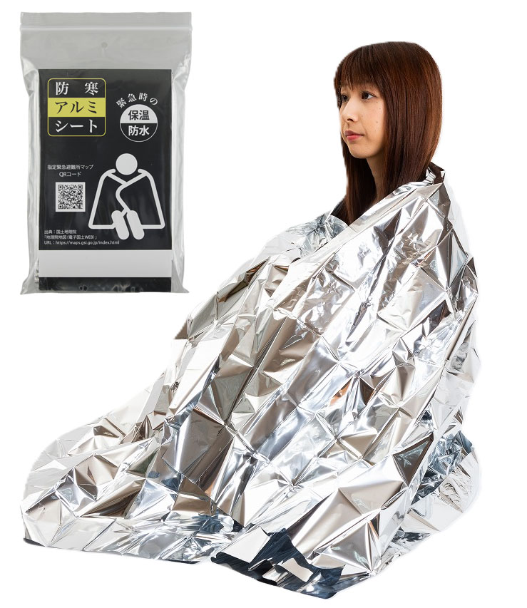 ●緊急時のブランケットに、また簡易防水シートにもなります。 ●緊急時の備えに、アウトドア時には携帯必須アイテム。 ●最寄りの避難所を探せる地図情報付き。 ●台紙+PE袋入り |