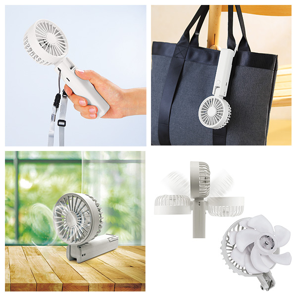 ●1WAY 手に持って、2WAY 卓上でも。 ●ヘッドが180度可動します。 ●2枚羽根設計でパワフルで心地よい。 ●カラビナ付き ●セット内容:本体、ネックストラップ、蓄電用ケーブル(Type-C) ●連続使用可能時間:約1.5〜4.5時間(風量により異なる) ●蓄電時間:約3時間 ●バッテリー容量:2000mAh ●化粧箱入 |