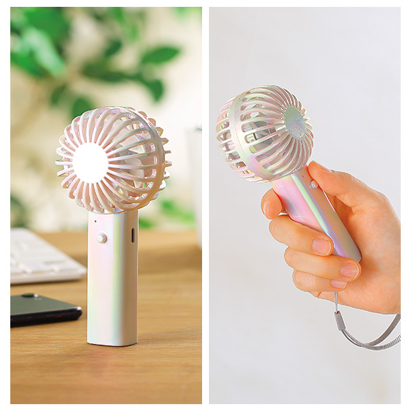 日差しに映えるオーロラカラーのハンディファン。