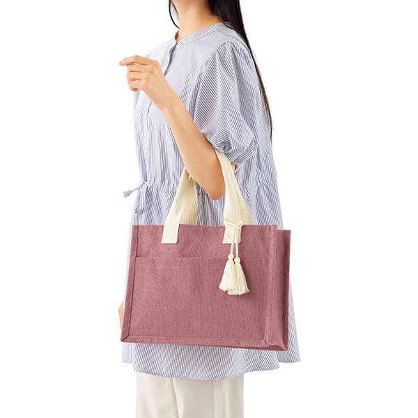 タッセルが揺れる愛らしいデザインのジュートバッグ。