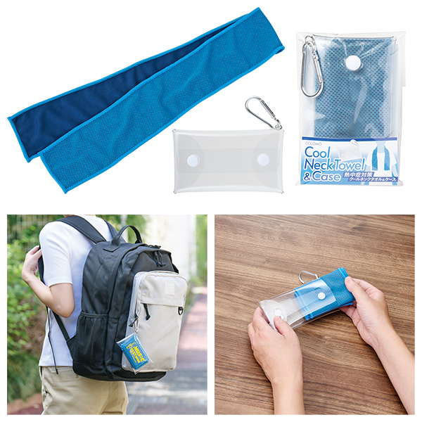首に巻くだけでひんやり気持ちいいクールタオルを、持ち運び便利なカラビナ付きケースとセットに。