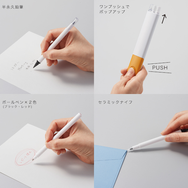 ●ケースのボタンをPUSHするとぺん先がポップアップ! ●セット内容:ボールペン黒、ボールペン赤、半永久鉛筆&セラミックナイフ ●フルカラー印刷対応 ●化粧箱入り |
