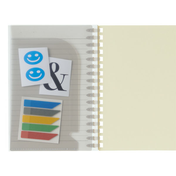 | 材質 | 表紙:ポリプロピレン(生地厚0.5mm) とじ具・ポケット:ポリプロピレン(生地厚0.2mm) リーフ:上質紙 |