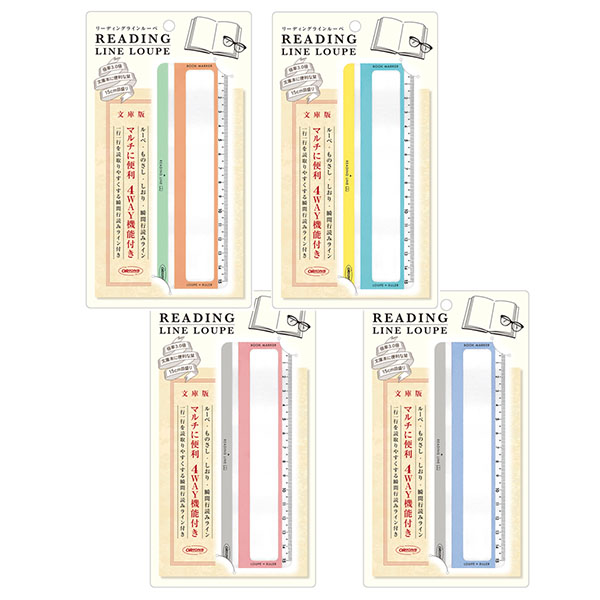 ●ルーペ、ものさし、しおり、瞬間行読みライン。 ●本のおともに! ●倍率3倍ルーペ ●瞬間行読みライン(透明3mm幅ラインで読み取る) ●定規15cm目盛り ●文庫本にぴったりのしおり(文庫本から栞となる部分が頭少し出ます) |