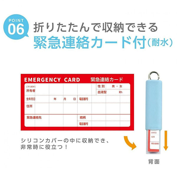●超コンパクト。 ●大音量110dBで、緊急時に助けを呼べる。 ●2種類の音で雑音や騒音の中でも聞こえやすい。 ●吹き口がシリコンなので清潔でくわえやすい。 ●シリコンと樹脂のダブル構造で丈夫で壊れにくい。 ●書いて消せる一言メモ欄付。 ●シリコンカバーの中に緊急連絡カード(耐水)が収納でき、非常時に役立つ! ●金属製フック ●ネックストラップ(安全ストラップ) ●重量:4.5g ●ブリスターケース入り |