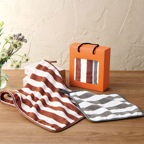 ●セット内容:フェイスタオル×1、ハンドタオル×1 ●進呈時に特別感のあるオレンジのパッケージ入り。 ●ループ付き ●持ち手付化粧箱入り |