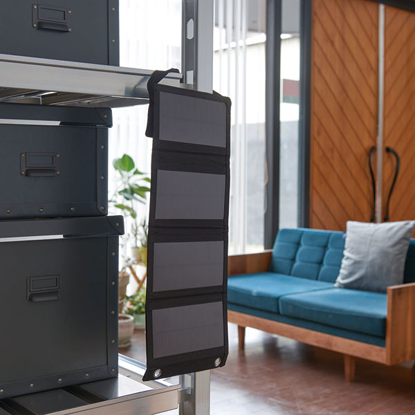 4枚のソーラー充電パネルをコンパクトにたたんで携帯。