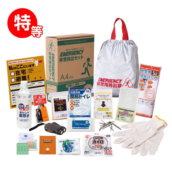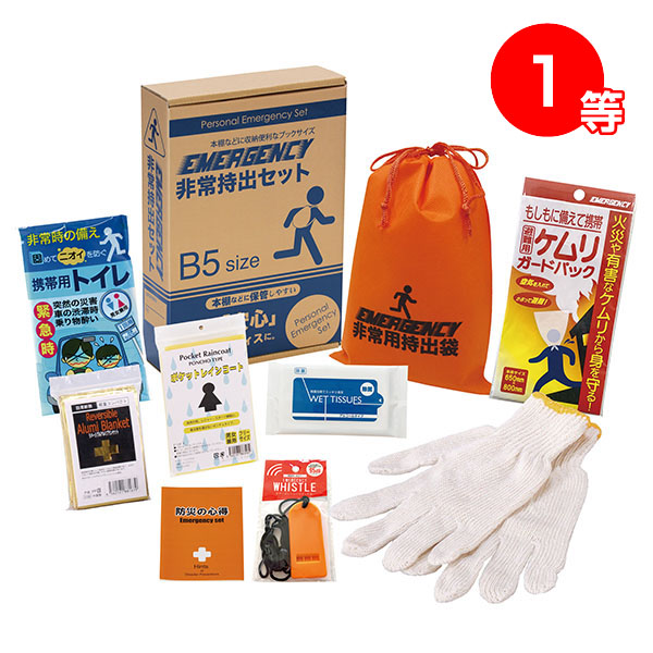 ●セット内容 特等 非常持出セット17点セットBT-40 2個 1等 コンパクト防災8点セットCB-15 3個 2等 ハンドプレッシングライト 4個 3等 リバーシブルアルミブランケット 6個 4等 IDホイッスル&カラビナリング 20個 5等 リフレクタータグ 65個 ●付属品:抽選箱×1、くじ×100、明細表×1、店頭用お知らせPOP×2、A3ポスター×1 ---------- ●非常持出セット17点セットBT-40 セット内容:非常用持出袋、綿棒&絆創膏、給水袋3L、軍手、除菌アルコールウェットティッシュ、アルミブランケット、カイロ、5年保存水500ml、水に流せるペーパー、緊急避難カード、レインコート、抗菌消臭トイレ、エマージェンシーホイッスル、マスク、ダイナモLEDライト、8徳ナイフ、防災の心得 ●コンパクト防災8点セットCB-15 セット内容:収納巾着袋、アルミブランケット、IDホイッスル&カラビナリング、防災用ウェットティッシュ、軍手、レインコート、携帯用トイレ1P、防災の心得 ※一部色・柄・商品が変更になる場合があります。 ※お支払いは銀行振込でお願いいたします。 |