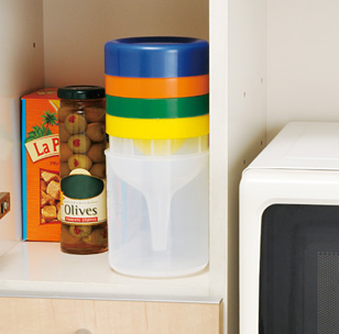 ●食器棚やシンクの上でもコンパクトに見た目スッキリ! ●一つになったキッチンツール 1.薬味おろし 2.黄身取り…セット内容の計量カップに載せて使用できます。 3.大根おろし…セット内容の計量カップに載せて使用できます。 4.レモン絞り…セット内容の計量カップに載せて使用できます。 5.ロート…詰め替えの際にとても便利です。 POINT ロートの口にある溝が容器との間に隙間を作り、空気穴になることで液体をスムーズに注げます。 6.計量カップ ●化粧箱入り |