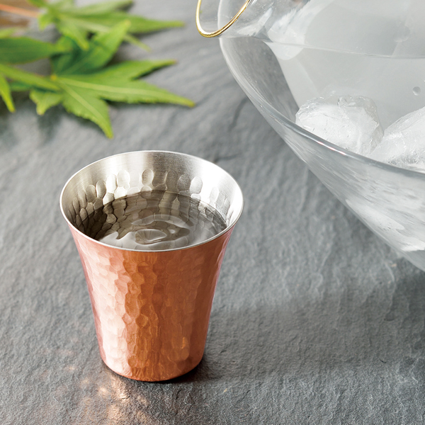 ●ヒンヤリとした至福の口当たりをお楽しみください。 ●容量:約65ml ●日本製 ●黒段ボール箱入り 素材に使われている銅の効果について 銅は鉄の5倍、ステンレスの25倍もの熱伝導率の良さを誇ります。銅カップを使用して冷たい飲み物を飲むと、口当たりや手に伝わる清涼感は格別です。また、銅には微量金属作用(銅イオン作用)という、 水に混ざるだけで驚異的な殺菌作用を発揮する性質があります。この銅イオンの働きが微生物の発生を防ぎ、銅食器を衛生的に保ちます。 |