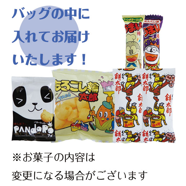 ●内容量:ぱんだろ〜×1、もろこし輪太郎×1、うまい棒コーンポタージュ味×1、うまい棒めんたい味×1、餅太郎×2 ●アレルギー:乳、小麦、卵 ●賞味期限:製造日より60日間(常温) ●裸梱包 ※お菓子の内容は変更になる場合があります。 |