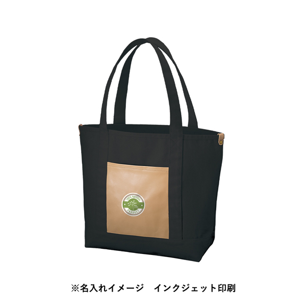 フロントポケットにレザーを使った大胆かつ都会的なムードのトート