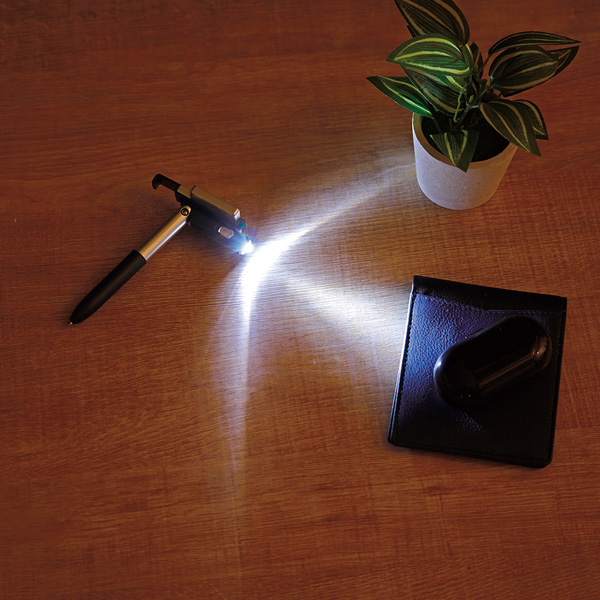 ●機能:ライト、ズームペン、タッチペン、スマホスタンド、パズル ●電源:ボタン電池AG4×3個内蔵(電池交換不可) ●ボールペン種類:油性インク ●インク色:黒 ●ボール径:0.7mm ●フルカラー印刷対応 ●箱入り |