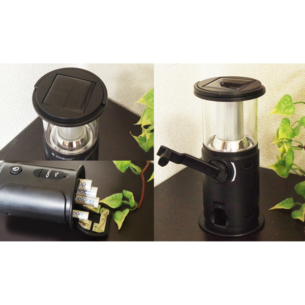 ●安心の3電源対応だから、これだけあればイザという時にも安心です。 ●長期保管が可能なスーパーキャパシタ(電気二重層コンデンサ)を採用しています。 ●7分間の手回し充電で、スマートフォンの通話が約25分可能です。(※) ---------- ●機能:LEDランタン、充電器 ●電源:太陽光充電(ソーラーパネル)、手回し充電(ダイナモ)、乾電池(単3形または単4形乾電池×3本使用(別売)) ●キャパシタ:2.7V 150F ●ソーラーパネル:単結晶ソーラーフィルム 0.3W 5V ●防塵・防水性能:IP54 ●ランタン:白色LED×9灯 ●充電用USB出力:5V ●付属品:USB充電ケーブル、取扱説明書(保証書付き) ●箱入り ※充電スピード目安:1分間150〜180回転した場合の使用可能時間です。 |