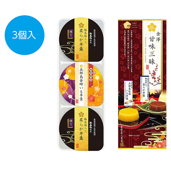 ●内容量:3個(輪島塩入り柔らか羊羹60g×2、五郎島金時いも羊羹60g×1) ●賞味期限:製造日より180日間(常温) ●化粧箱入り ※お支払いは銀行振込でお願いいたします。 |