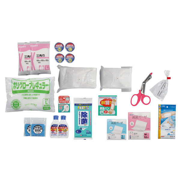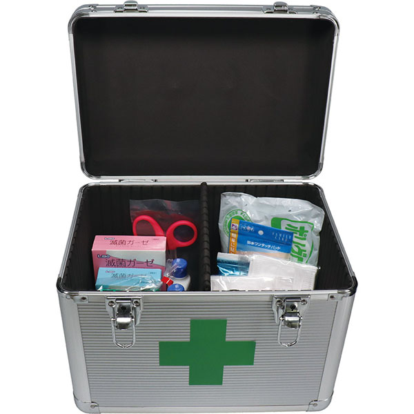 ●【セット内容】 三角巾×2、伸縮包帯(M×3、L×1)、滅菌ガーゼ(S×15枚、M×12枚)、サージカルテープ、消毒液×2、消毒ウェットティッシュ(10枚)、救急絆創膏(M×100枚)、防水パッド(M×5枚)、ポリグローブ(L×100枚)、マスク(ふつう×6枚、こども用×4枚)、毛抜き、万能ばさみ、一方弁マスク×2、アルミケース ●重量:約3.2kg ●ダンボール入り |