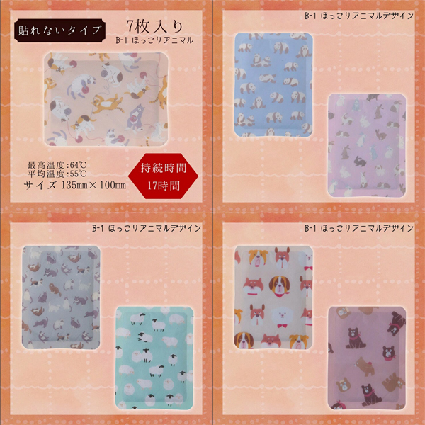 ●7枚セット、すべて違う柄なので1週間を毎日違うデザインでお使い頂けます。 ●本製品は品質保証の国際規格ISO9001の承認を取得した工場で製造しています。 ●持続時間:約20時間(40℃以上を保持し、持続する時間) ●最高温度:約64℃ 平均温度:約55℃ ●化粧袋入り ※注意 使い捨てカイロです。用途以外に使用しないでください。 ご使用になる前に使用上の注意をよくお読みのうえ、正しくお使いください。 【保存方法】直射日光を避け、涼しい所に保管してください。幼児の手の届く所に置かないで下さい。 【廃棄方法】使用後は市区町村の取り決めに従って廃棄してください。 |