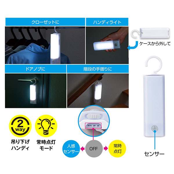 クローゼットやドアノブに吊り下げできるフック付きの人感センサーライト。手持ちのライトとしても。