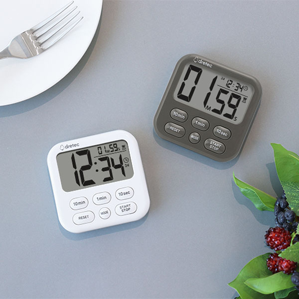 時計とタイマーを同時にチェックできる2in1画面のキッチンタイマー