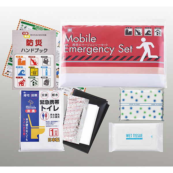 ●セット内容:1.携帯トイレ1P、2.ポケットティッシュ、3.ウェットティッシュ10枚、4.防災ハンドブック、5.IDカード ●重量:約105g ●チャック袋入り |