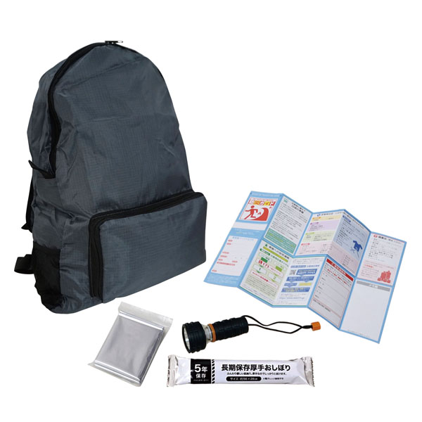リュック型の袋を使用。地震や台風などの非常時の備えに。