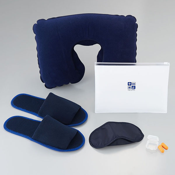 ●セット内容:スライダー付き収納ポーチ、首枕、アイマスク、耳栓、スリッパ ●耳栓はケース入りなので携帯に便利。 ●重量:125g ●袋入り |