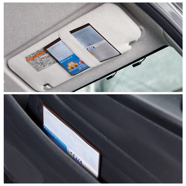 自動車のダッシュボードだけじゃなく、サンバイザーに挟んだり、ドアのサイドポケットに収納可。ラクラク取り出し!
