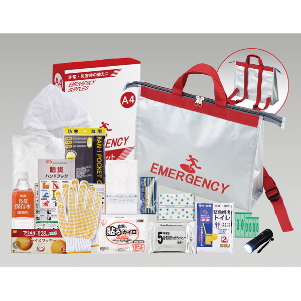 ●セット内容:避難用トートリュック、強力9光ライト、ホイッスル、携帯トイレ2P(2回用)、ウェットティッシュ(20枚入)、ポケットティッシュ、防災ハンドブック、防寒レインコート、軍手、エイトバン(大小×各2)、使い捨てカイロ、マスク、備蓄用飲料水(500ml)、ライスクッキー(※アレルギー物質28品目不使用) ―――――――――――――――――― ●地震・災害などで急いで避難する時に、避難場所までの移動を素早く行えるよう「最低限必要と考える防災グッズ」をセットした避難セット。 ●トートバッグとしても。リュックとして背負うことも。 ●体に合わせて調整ができます。 ●A4サイズパッケージ入りで書棚やデスクの引き出しにも収納可能! ●保存期間:約5年 ●9光ライト:単四乾電池3本使用(別売) ●重量:1290g ●F段化粧箱入り |