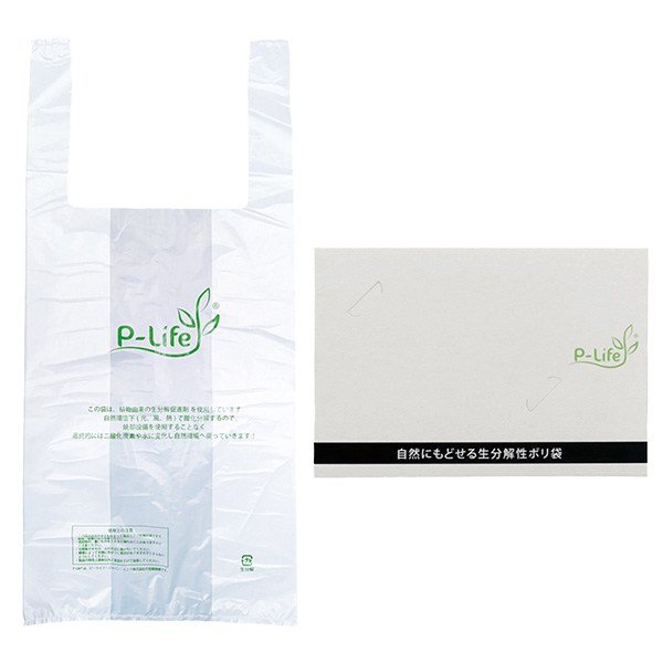 環境に配慮した自然に戻せるP-LIFE(生分解促進剤)を添加した持ち手付きポリ袋です。