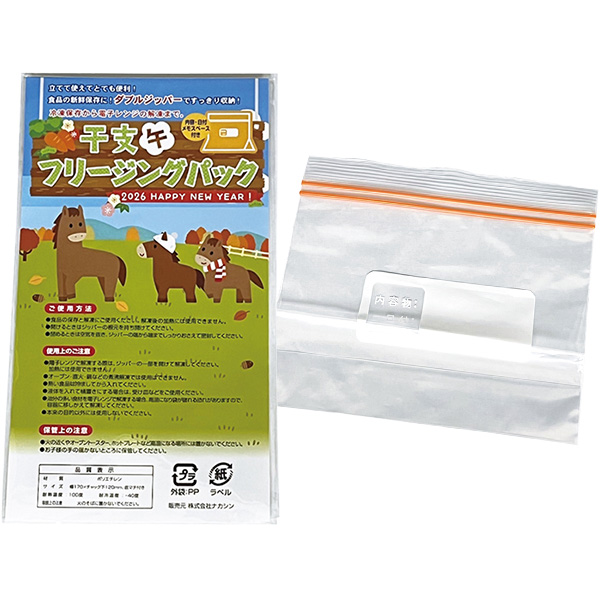 干支柄パッケージ入りの、冷蔵庫のお片付けに役立つマチ付きフリージングパックです。