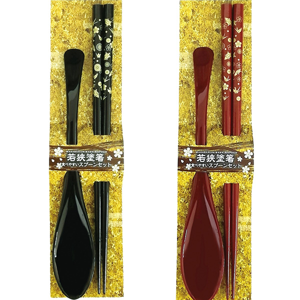 縁起の良い鶴と亀をモチーフにしたデザインの若狭塗箸と石川県産のスプーンのセットです。