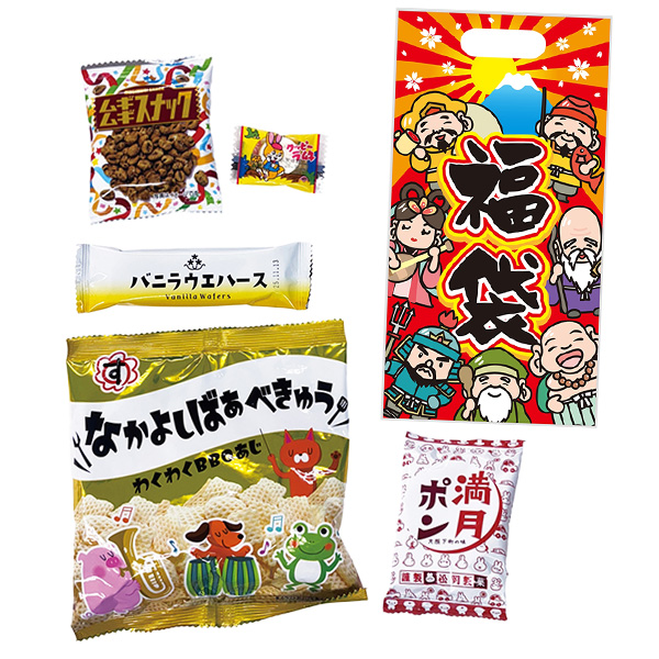 フルカラー印刷の鮮やかさがインパクト大!コスパに優れた人気のお菓子福袋です。