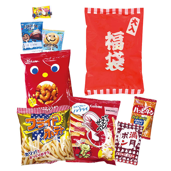 ●セット内容:若鳩フライドポテト(10g)×1、東ハトキャラメルコーン(20g)×1、カルビーかっぱえびせん(26g)×1、不二家カントリーマアム(ココア)×1、不二家カントリーマアム(バニラ)×1、松岡満月ポン小判1枚×1、アジカルハッピーターン1枚×1、カクダイ粒クッピー×1 ●賞味期限:製造日より120日間(常温) ●福袋入り ※お菓子の種類は変更される場合があります。 ※入金確認後出荷まで約5日間かかります。 ※お支払いは銀行振込でお願いいたします。 |