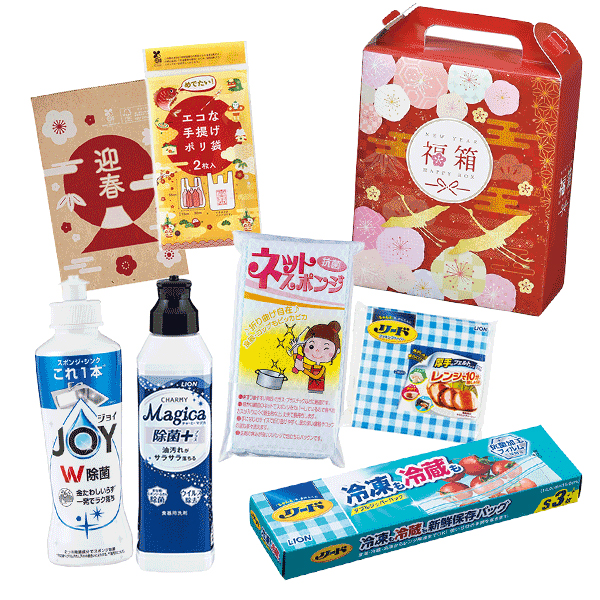 ●セット内容:P&G除菌ジョイコンパクト170ml(さわやか微香)×1、ライオンCHARMYMagica220ml(除菌+)×1、ライオンリード冷凍も冷蔵も新鮮保存バッグS3枚×1、ネットスポンジ×1、めでたいエコな手提げポリ袋2枚入×1、迎春柄紙製水切り袋1枚×1、ライオンリードクッキングペーパー小4枚×1 ●持ち手付福箱入り ※入金確認後出荷まで約7日間かかります。 ※お支払いは銀行振込でお願いいたします。 |
