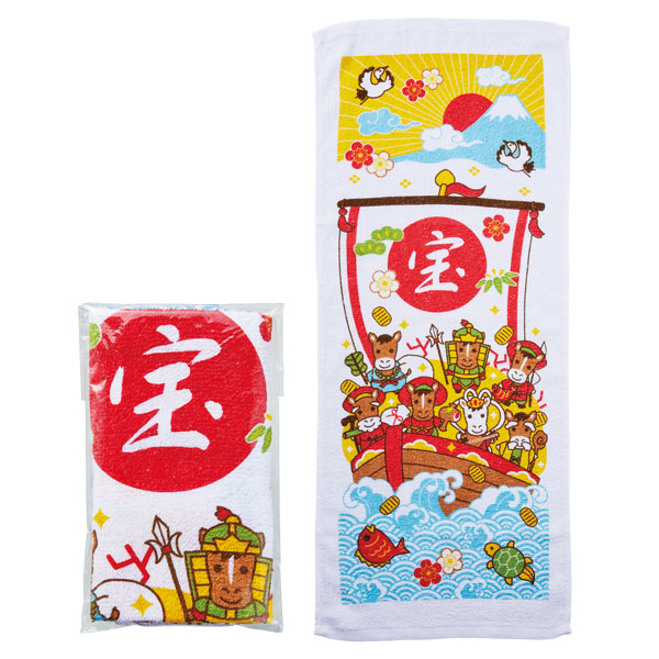 大きな宝船に乗った七福神をモチーフにした、干支「午」のお年賀タオル。
