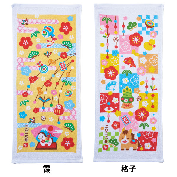 干支と和柄が散りばめられた華やかなデザインタオル。