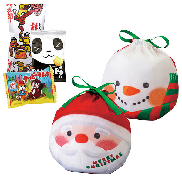サンタと雪だるまがプリントされた、ころんとかわいい巾着に入ったお菓子セットです。