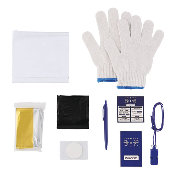 ●セット内容:軍手、アルミブランケット、ホイッスル、ゴミ袋(3枚)、防災の心得帳、ボールペン、メモ帳、圧縮タオル、ポーチ ●ポリ袋入 ※商品のセット内容、パッケージのデザインが変更になる場合がございます。 |