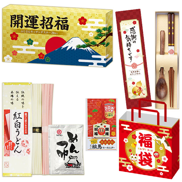 ●セット内容:キッチンダスター(20枚入り)、天然木箸とスプーンセット、紅白うどん、ミニ絵馬キーホルダー、福袋小 ●アレルギー:小麦 ●賞味期限:1年半(うどん) ●おみくじ付きのミニ絵馬キーホルダーもおまけで入っており、新年をより一層楽しめます。 ※袋詰めはお客さまでお願いします。 ※数量限定のため、内容が一部変更になる場合がございます。 ※入金確認後出荷まで約5日間かかります。 ※お支払いは銀行振込でお願いいたします。 |