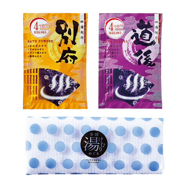 ●人気温泉地をイメージした入浴剤が2包と、綿100%の肌触りのよいタオルをセットしたおすすめのプチギフト。 ●セット内容:入浴剤25g×2包(別府・道後)、タオル ●包装袋入り(名刺ポケット付) |